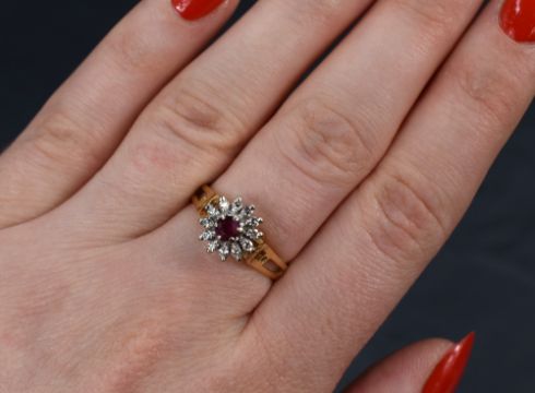 A ruby and diamond cluster ring, the central round cut ruby measuring approximately 0.20ct, with a twelve diamond surround, having pierced shoulders on an 18ct gold shank, ring size N, 3.9g