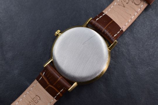A gent's gold plated Omega wrist watch having baton numeral dial to silvered face on a tan leather strap with gold plated Omega buckle, with case, no papers, watch working when wound but we do not test for functionality