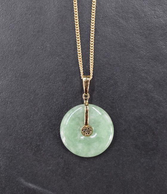 A Chinese jade disc pendant with 14ct gold mount and central Chinese character, on a 9ct gold chain, 5.6g