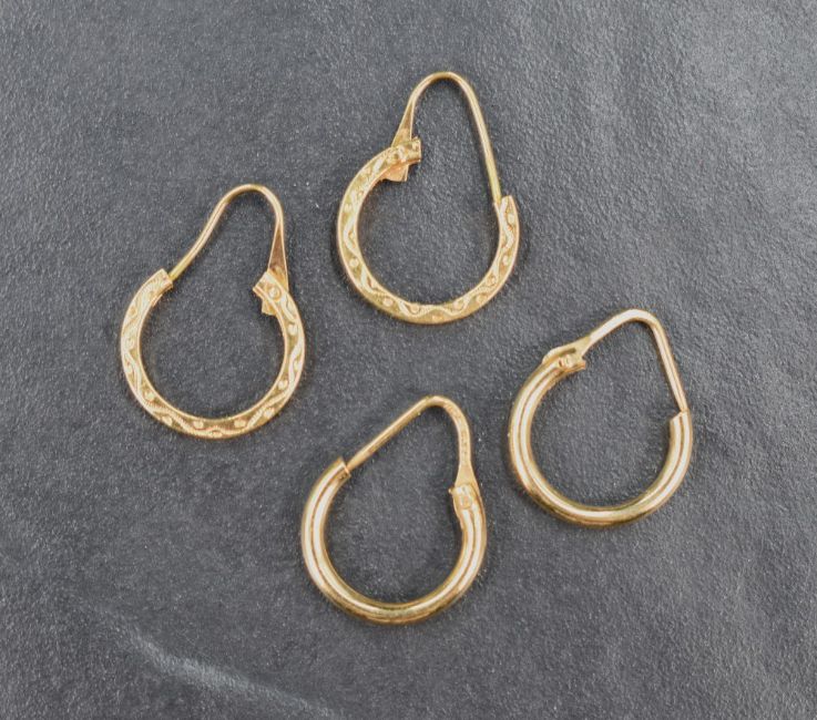 Two pairs of 18ct gold hoop earrings, one pair of rounded plain design, the other having engraved decoration to both sides, 2.4g