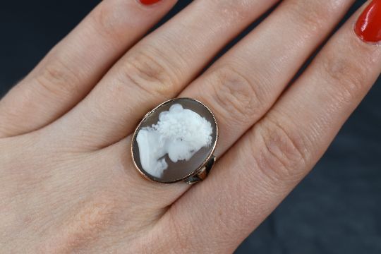 A rose metal shell cameo ring, the bezel set cameo depicting Antinous, a friend of Emperor Hadrian, having split shoulders on an unmarked shank, ring size I, 5.3g. Cameo is slightly worn with tarnishing at shoulder joins