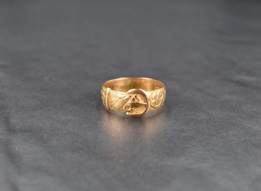 An 18ct buckle ring having moulded detail, size R & approx 4.5g