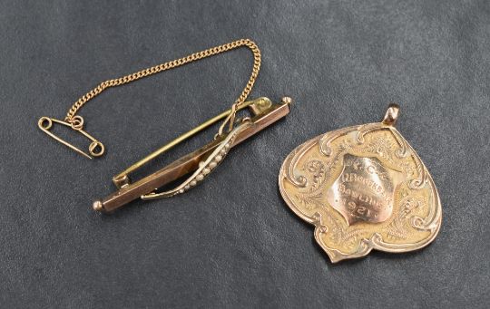 A 9ct rose gold medalion with presentation inscription dated 1921 and a 9ct rose gold bar brooch with seed pearl decoration, approx 7g