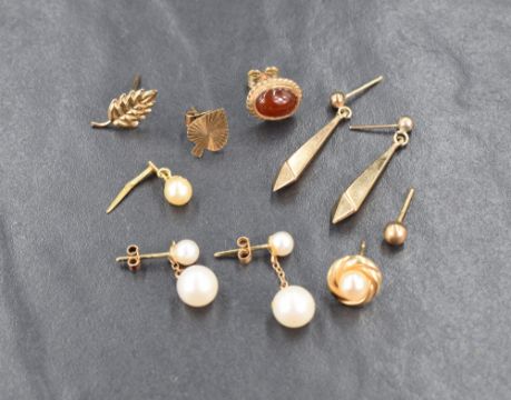 An assortment of gold and yellow metal earrings, including cultured pearl examples, 4.1g gross