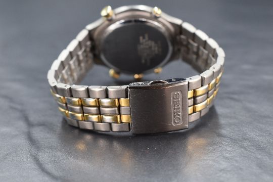 A Seiko quartz chronograph titanium wristwatch, the white dial with dot five minute markers, date aperture and three subsidiary dials, numbered 140231 and 7T42-6A6A to reverse on a stainless steel bracelet, in Seiko box