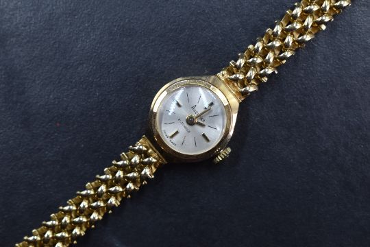 A lady's 9ct gold wrist watch by Accurist having a baton numeral dial to small circular face in a plain case on a 9ct gold decorative linked bracelet strap, approx 14.3g gross