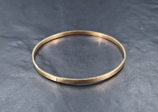 A yellow metal bangle, marked 9ct having alternating panels of textured and plain design, approximately 20cm inner circumference, 11.3g.
