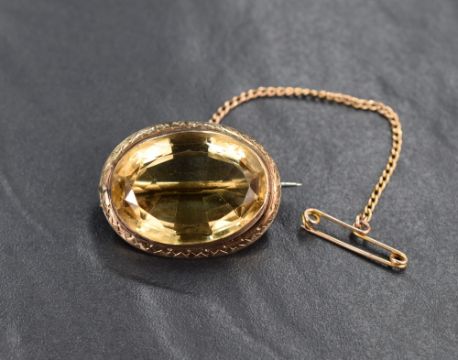 An impressive citrine brooch, the oval cut citrine measuring approximately 17.5mm W x 23.8mm L x 9mm D, in a yellow metal bezel setting with decorative engraving to edge and safety chain, 8.3g