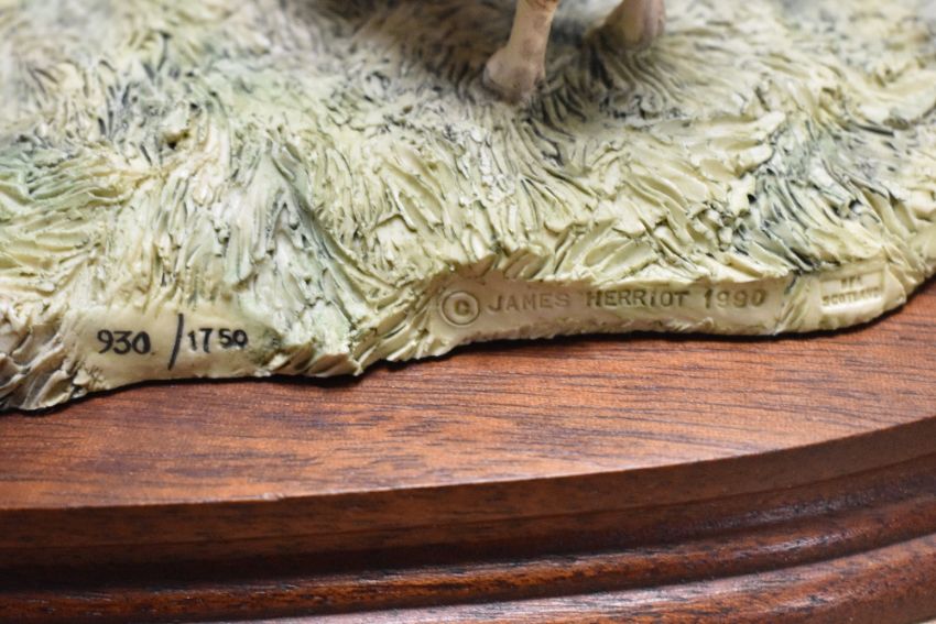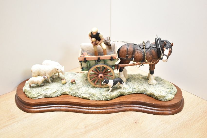 A limited edition Border Fine Arts agricultural group 'Supplementary Feeding' a farmer feeding turnips to his sheep from his horse drawn cart, number 930/1750 designed by J A Butler for The James Herriot series c1990, raised on a moulded mahogany plinth 38cm wide