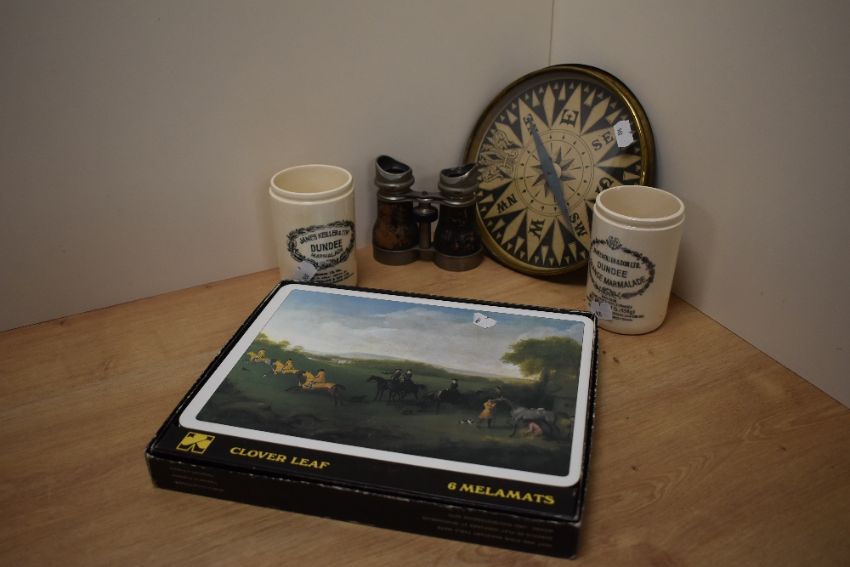 A 19th/20th century gilt metal mounted ships compass, with printed paper 'card' lacking gimbal apparatus, 21cm sold together with a pair of field glasses, two Dundee stone ware marmalade jars and boxed Clover Leaf mats.