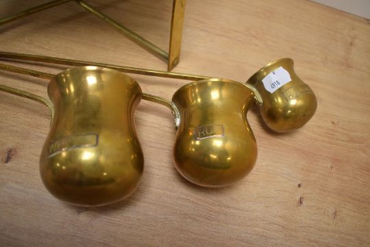 A group of three graduating brass 'Toddy' ladels, whiskey, rum and brandy, sold along with a brass trivet and copper kettle