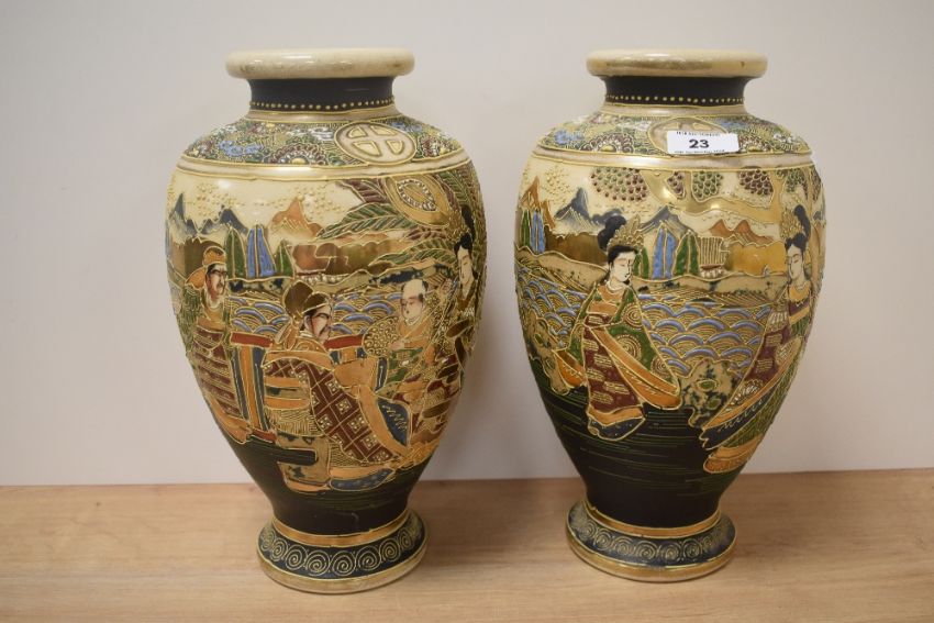 A pair of 20th century Japanese Satsuma pottery vases, of ovoid form and decorated with figures within landscape settings, painted character marks to base, 31.5cm crazing throughout,