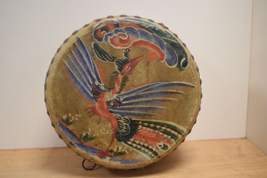 A Chinese hand-decorated double sided Tanggu drum, decorated with dragon and phoenix 31cm