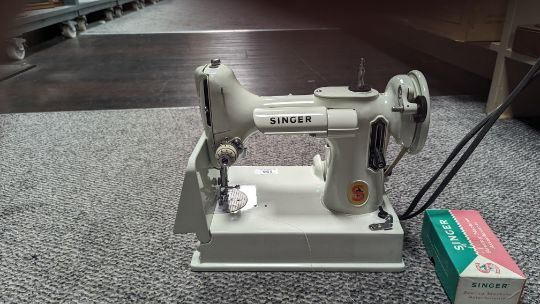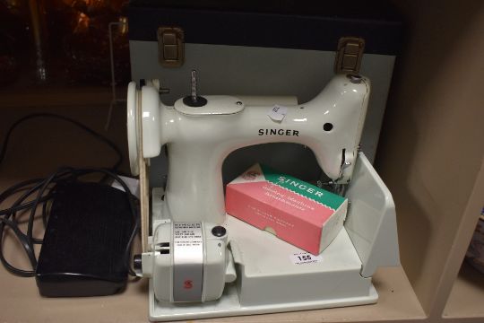 A vintage Singer lightweight 221k sewing machine, sold with hard case and sewing machine attachments.