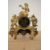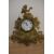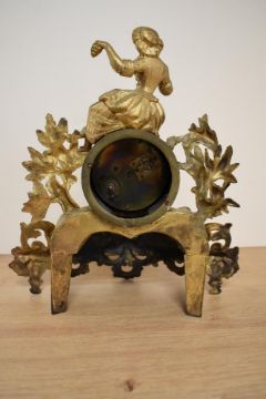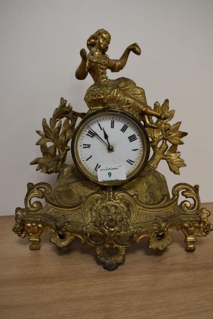 A late 19th Century French gilt metal mantel clock with key, having a figural surmount above an enamelled Roman dial behind glass, measuring 32cm high