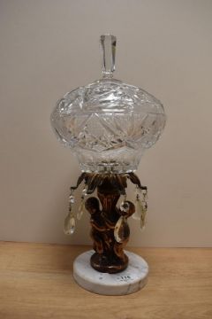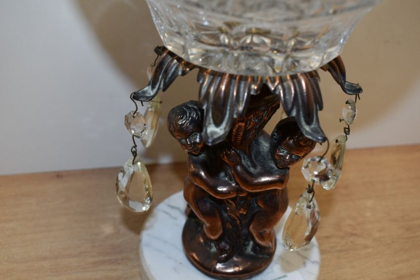An early 20th century pressed glass, cast metal and variegated white marble centre-piece, the cover with elongated handle over the figural column with facet cut drops, on a circular marble base