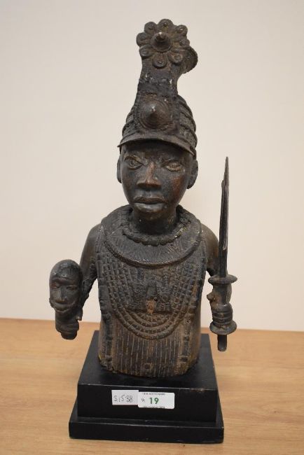 An attractive Benin (Nigerian) Bronze half torso, depicting a warrior with elaborate headdress holding a sword and head with nicely proportioned features, raised on a stepped ebonised base 40cm overall