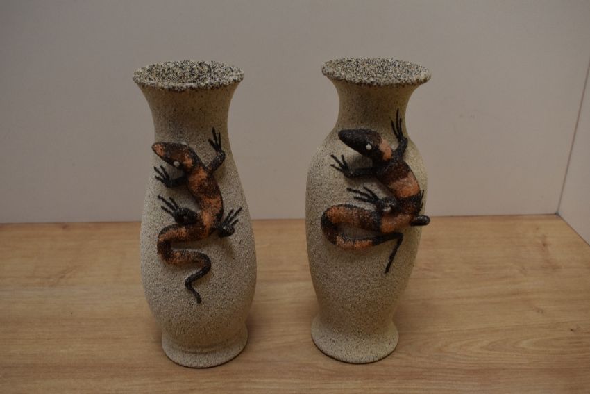A pair of attractive 20th Century stoneware vases, having applied lizard decoration, each measuring 21cm high