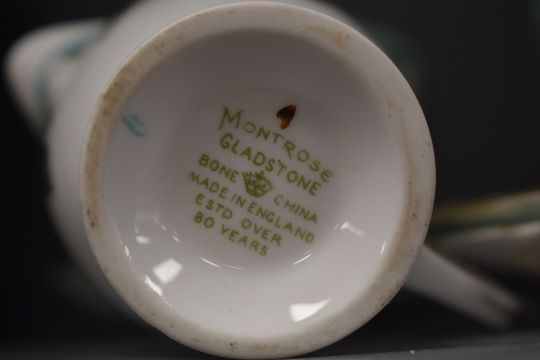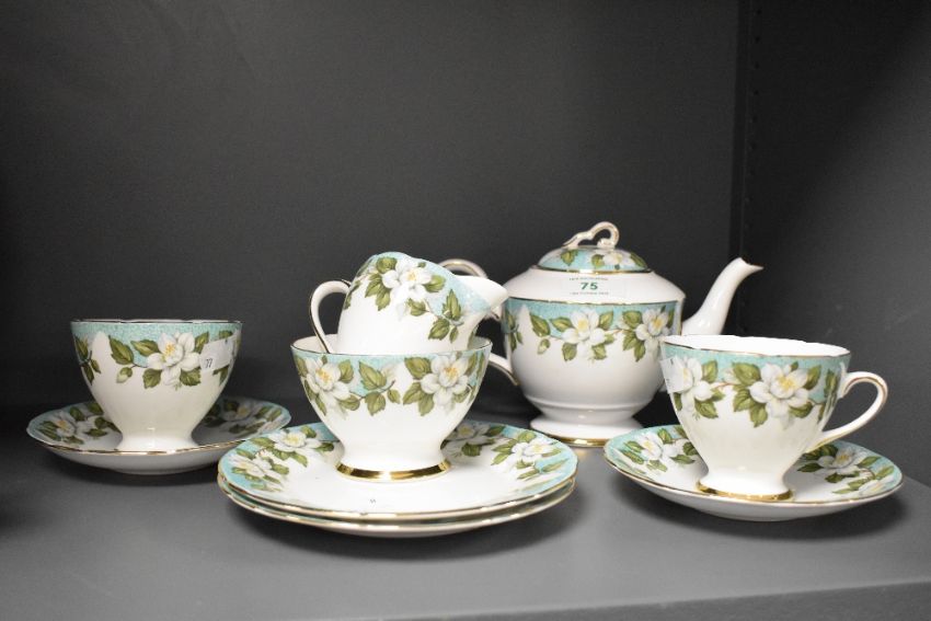A small collection of early 20th Century Gladstone china teaware, decorated in the Montrose pattern with white flowers against a turquoise edge