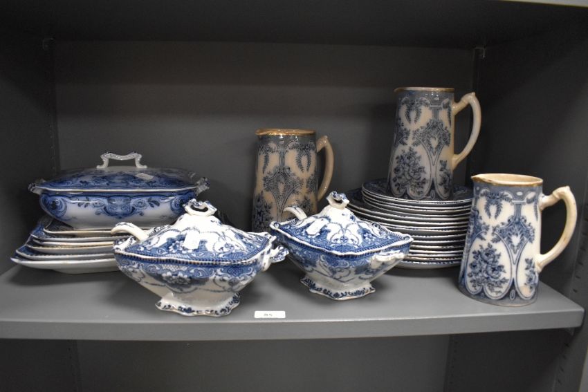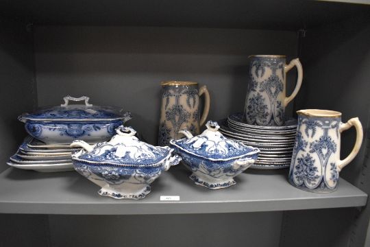 A selection of 19th/20th Century blue and white ironstone tableware, including lidded soup tureens, jugs, and ashettes