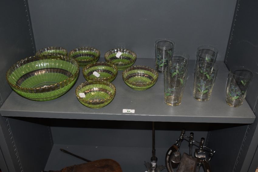 A mid-20th Century textured glass trifle set, having a green banded design and gilt accents, together with six hand painted floral drinking glasses