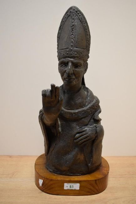 A 20th Century sculpture bust, depicting a papal figure, raised on an oval pine plinth, altogether measuring 44cm high
