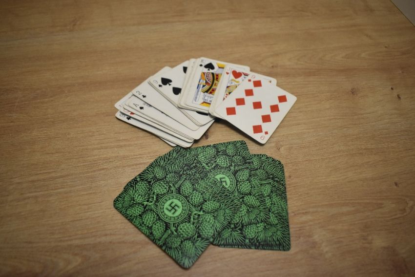A bundle of vintage playing cards, the reverse printed with a Swastika design