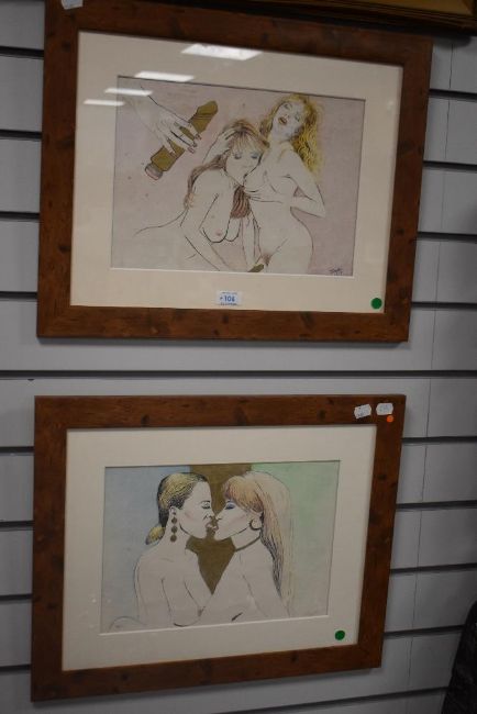 Tom Dearden (1942-2020, British), mixed media, Two erotic illustrations featuring nude women, signed to the lower right, each framed, mounted, and under glass, measuring 22cm x 31cm, & 42cm x 51cm overall