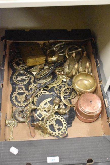 A mixed selection of copper and brass ware comprising horse brasses, a pair of decorative storage bowls formed as swans and a pair of thistle shaped candlesticks etc.
