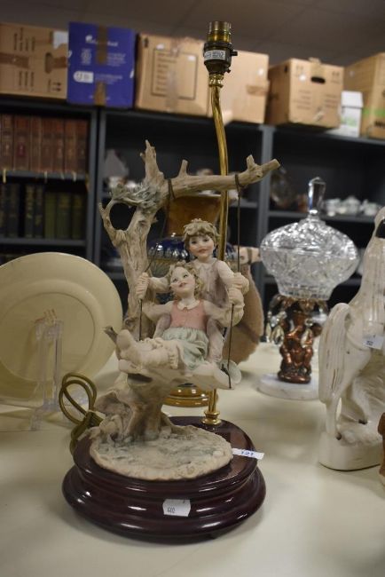 A mid-20th Century Capodimonte porcelain lamp, modelled as two children on a swing and measuring 52cm high