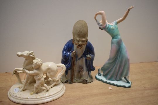 An Eichwald glazed pottery figural desk stand, modelled as a young boy with horse and measuring 18cm high, together with a Chinese glazed pottery deity study, and an Art Deco study of a dancing woman (with damage to the fingers)