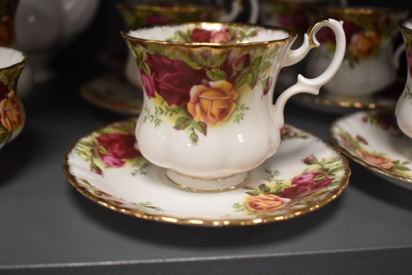 A Royal Albert six setting coffee set in the Old Country Roses pattern, comprising coffee pot, coffee cups and saucers, milk jug, and sucrier