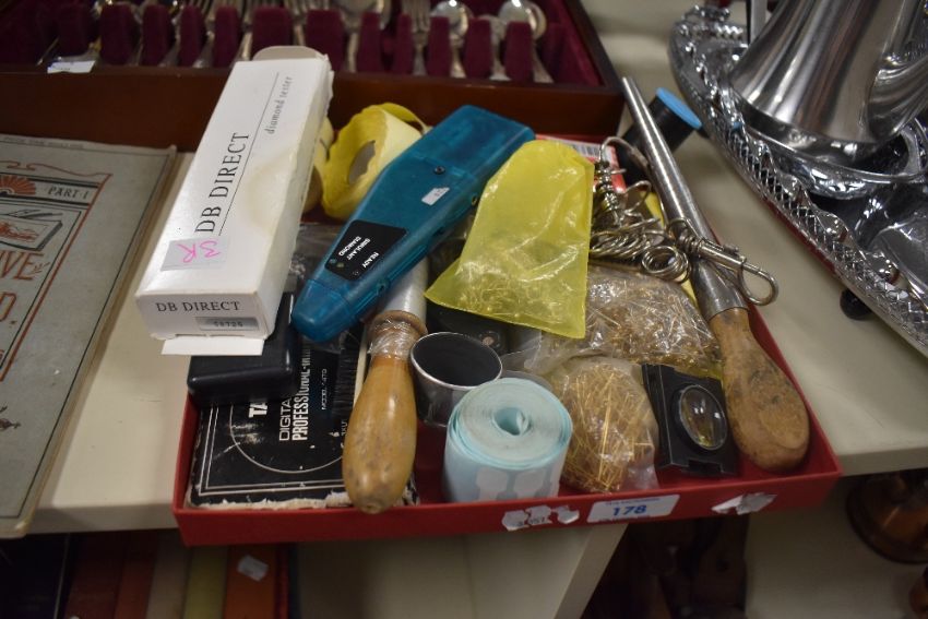 An assortment of jewellery making and gemmology items, including loupes, ring sizers, ring size measurement rings, scales and a DB Direct diamond tester, etc