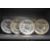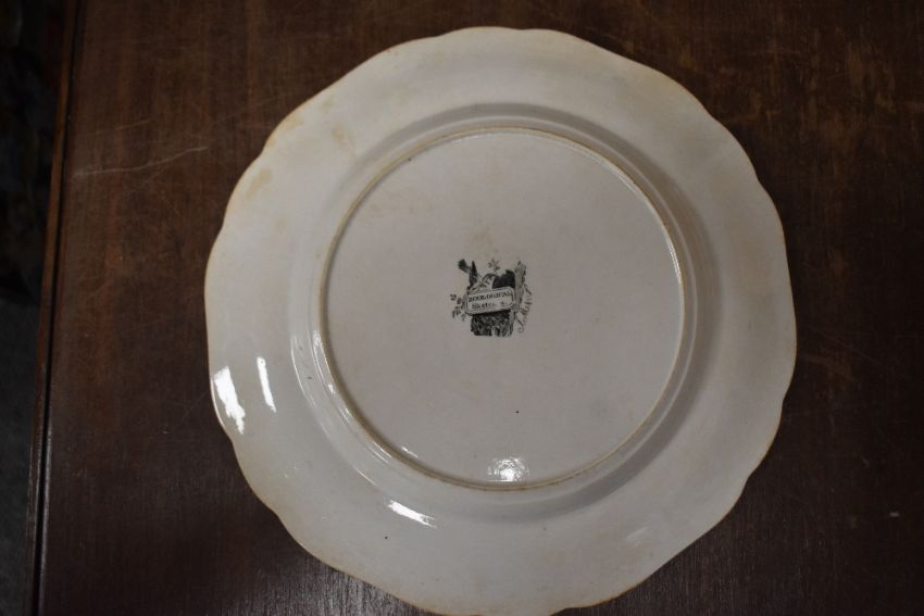 Condition Report: Four with crazing and staining and some wear to the rims moulded decoration,when tapping plates four sound dull, the other plate makes a slightly higher pitch sound. Additional photos of the back have been taken.