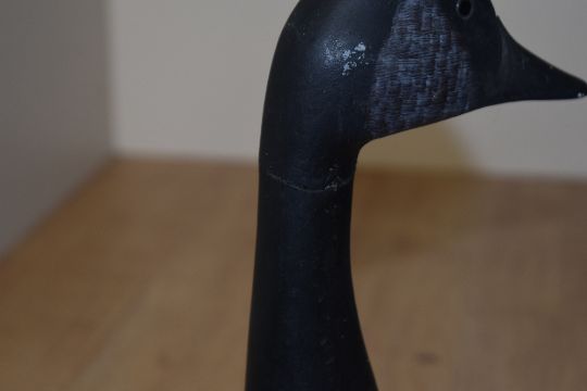 A 20th Century painted wood candle box in the form of a duck, measuring 34cm long, together with a selection of painted wooden duck decoys and sculptures including an attractive black painted duck decoy with glass eyes and marked 'Adagio' to the underside, two geese studies, and three wall hanging mallard duck studies