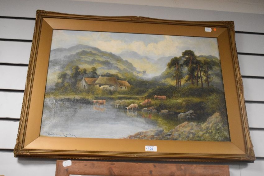 William Langley (c.1880-1920, British), oil on canvas, Watering cattle in a Scottish Highland landscape, signed to the lower left, framed, not glazed, measuring 40cm x 60cm, & 53cm x 73cm overall