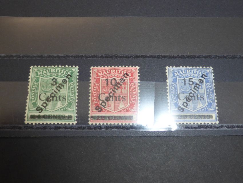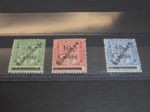 MAURITIUS 1925 SET OF 3 SURCHARGED VALUES OPTD SPECIMEN (SG 242s/44s) MNH Trio of surcharged and optd values from 1925 from Mauritius. All unmounted mint, although we note possible minor gum disturbance to 3c on 4c green. Couple of nibbled perfs seen on 3c and 15c, non the less this shouldn't detract from this set of Specimen opts.