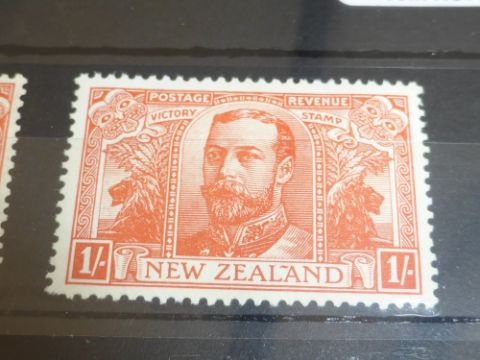 NEW ZEALAND 1920 PAIR OF 1 SHILLING ORANGE-RED VICTORY VALUES MINT (SG 458) Duo of victory top values (1 shilling) from 1920, value to left lightly mounted mint, value to right slightly heavier hinge. Slight shade variation from we presume a different print run.