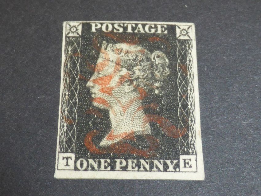 GB 1840 1D BLACK, PLATE 6, 4 MARGINS, CORNER LETTERS T E. WITH LIGHT RED MALTESE CROSS CANCEL Fine example of 1d black, 2 good margins, 2 average corner letters T E from plate 6. Value with light red maltese cross cancel.
