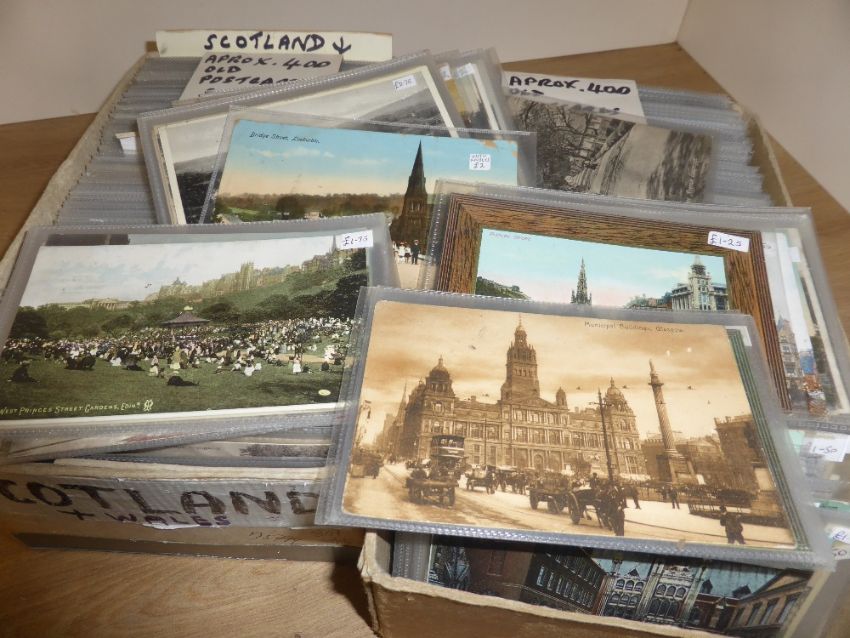 POSTCARDS, 2 BOXES OF APX 800 TOPOGRAPHICAL INC SCOTLAND & WALES POSTCARDS Boxes with an estimated 400 or so in each box. Largely topographical from the UK and a box with Welsh and Scottish material. All appear to be in protective sleeves. Some light faults here and there (eg corner dints etc)