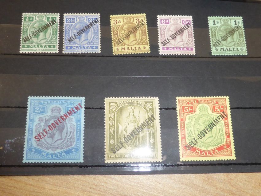 MALTA 1922 GV SELF GOVERNMENT SET OF 8 MINT (2 SHILLING IS MULTI SCRIPT WMK) Card with set of 8 Self Government values from 1922. All values except the 2 shilling are Multi crown variants, the 2 shilling being multi script. All mounted mint,