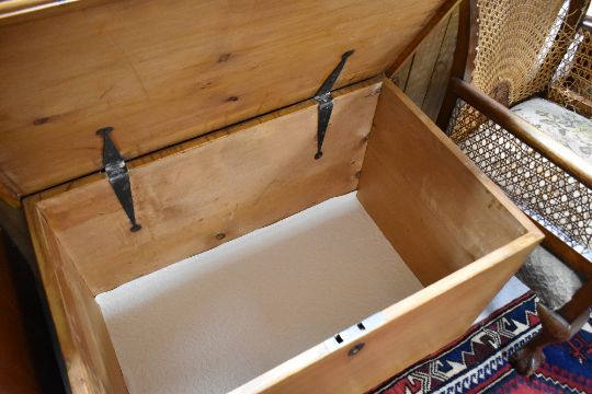 A traditional stripped pine bedding box, approx. Width 85cm, depth 53cm, height 48cm