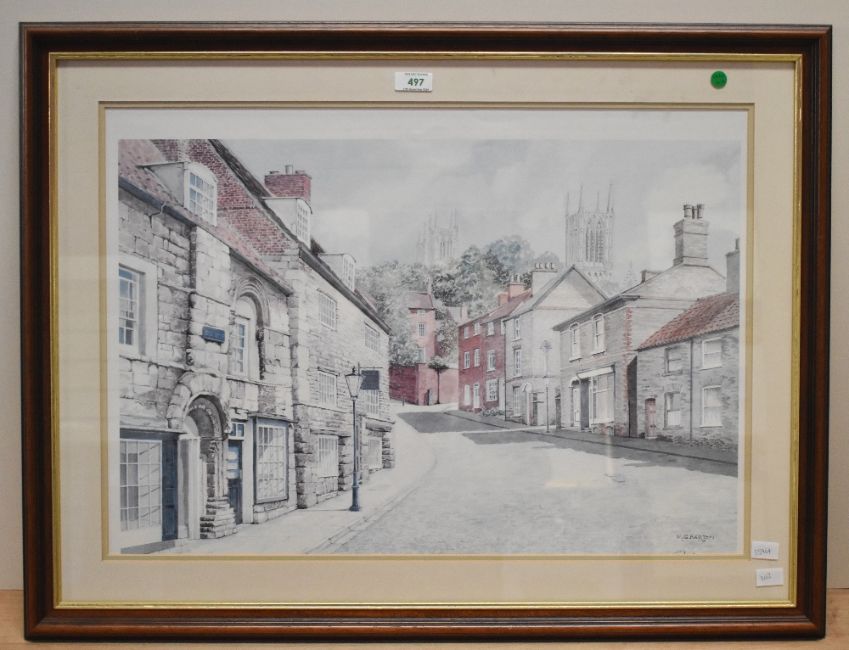 After R.G. Barton (20th Century, British), coloured print, 'Steep Hill, Lincoln', framed, mounted, and under glass, measuring 43cm x 60cm, & 59cm x 77cm overall, together with a print after John Atkinson Grimshaw (1836-1893, British) (2)