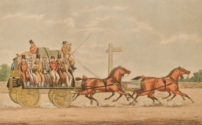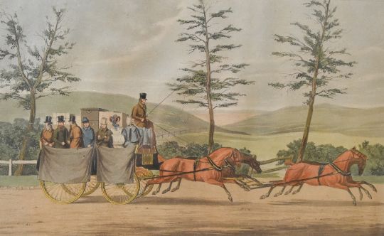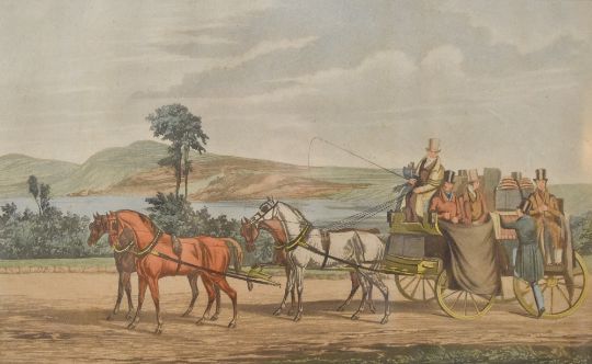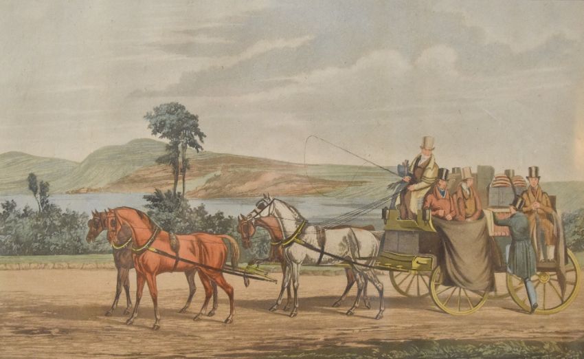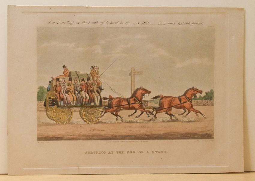 After Michael Angelo Hayes (1820-1877, British), coloured engravings, Six illustrations from 'Car-Travelling in the South of Ireland in the year 1856 - Bianconi's Establishment', five framed and under glass, measuring 28cm x 40cm, & 31cm x 43cm overall (6)