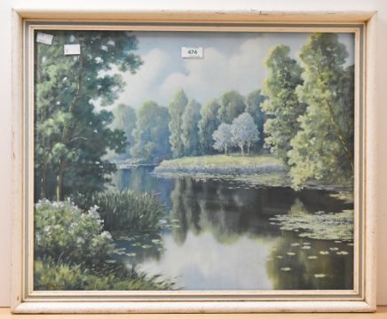 After E Gaufrioun, a colour print showing a soothing landscape scene, with trees, pond and lily pads. Framed and under glass.
