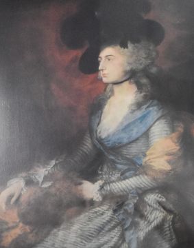 After Thomas Gainsborough (British, 1727-1788). Colour print of a seated portrait of Mrs. Sarah Siddons, a famous Welsh actress active in the 18th Century. Housed in golden coloured mount and in gold painted wooden frame. 33.5cm x 40cm, 57cm x 69.5cm overall.