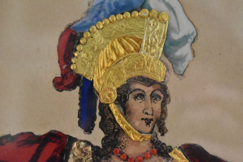 Joseph Hope Williams (British 20th century) Miss M Footer as Britannia, mixed media, a hand-coloured and embellished engraving, within a card mount and moulded gilt frame, under glass 24cm x 19cm & 41cm x 34cm