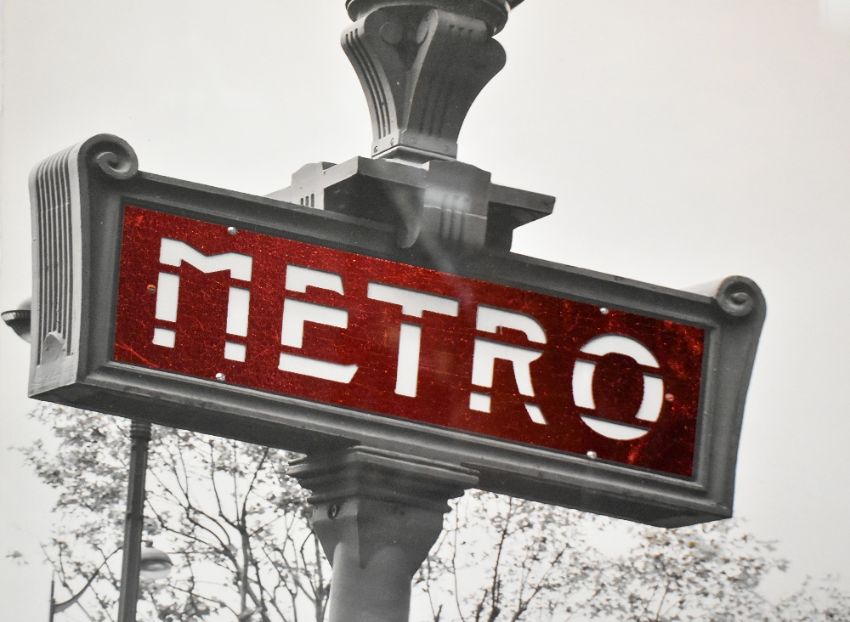 Contemporary, a Parisian poster print depicting a Metro stop and the Eiffel Tower, framed and under glass, measuring 44cm x 60cm, & 50cm x 64cm overall