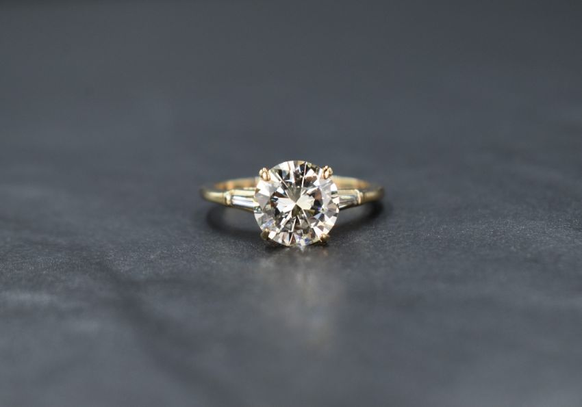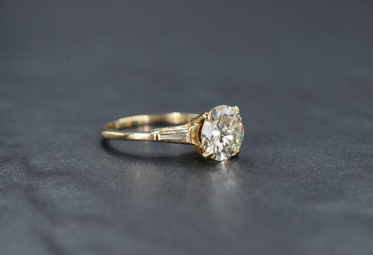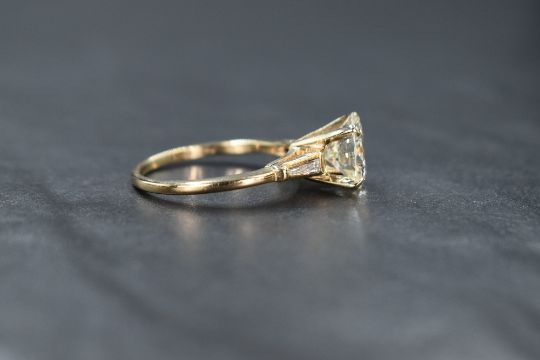 A 14ct gold diamond solitaire ring, the central round brilliant cut diamond measuring approximately 2.75ct, Colour M, Clarity VVS1, flanked by two tapered baguette cur diamonds measuring an approximate total of 0.25ct, colour J, clarity VVS, ring size P, 3.6g