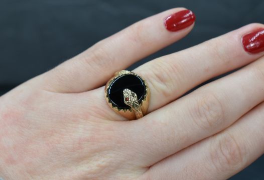 A 9ct gold signet ring having oval jet panel with serpent decoration, size M & approx 4.2g